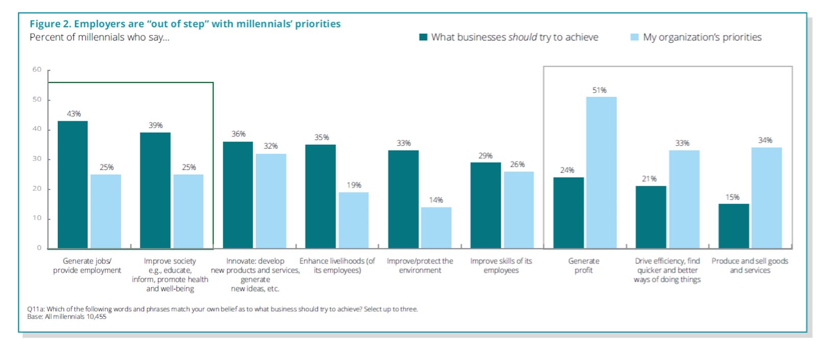 A sense of purpose. “Businesses have no ambition beyond profit” – that’s the feeling millennials shared in the Deloitte Millennials survey. For them, the success of tomorrow’s organisations will depend on their willingness to adopt a long-term sustainability vision, and millennials want to be part of the positive impact businesses can have on society and the environment. For 70% of them, the organisation they will choose to work for needs to share their personal values, which demonstrate a clear link between their engagement to the organisation and their sense of purpose, however, organisations do not always prioritise issues that matter to millennials.