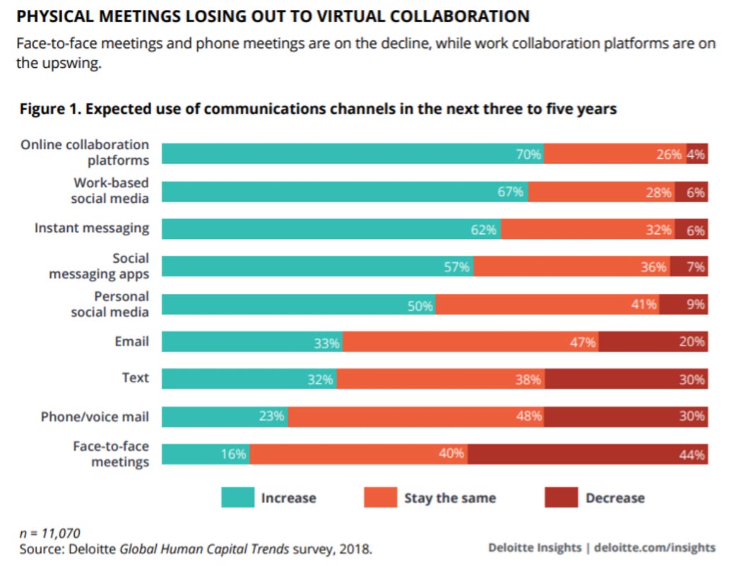 Even though very connected, 58% of the Middle-Eastern millennials prefer face-to-face meetings when communicating with colleagues at work. However, respondents of the 2018 Deloitte Global Human Capital Trends survey believe at 44% that face-to-face meetings will decrease in the future and be replaced by many different communication channels such as collaboration platforms, work-based social media and instant messaging, highlighting their need for multiple sources of information and instantaneity.