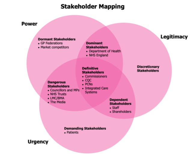 This more sophisticated analysis identified IM’s definitive stakeholders as Commissioners, the Care Quality Commission, Integrated Care Systems and Primary Care Networks, for they have the power, urgency and legitimacy. Although local councillors, NHS Trusts and the media were classified as dangerous, yielding urgency and power, they did not have legitimacy. As IM is accountable to the CQC and their Commissioners, the decisions of these groups would directly impact on business growth through IM winning more contracts. These latter stakeholders therefore needed to be prioritised and targeted in a strategic way.
