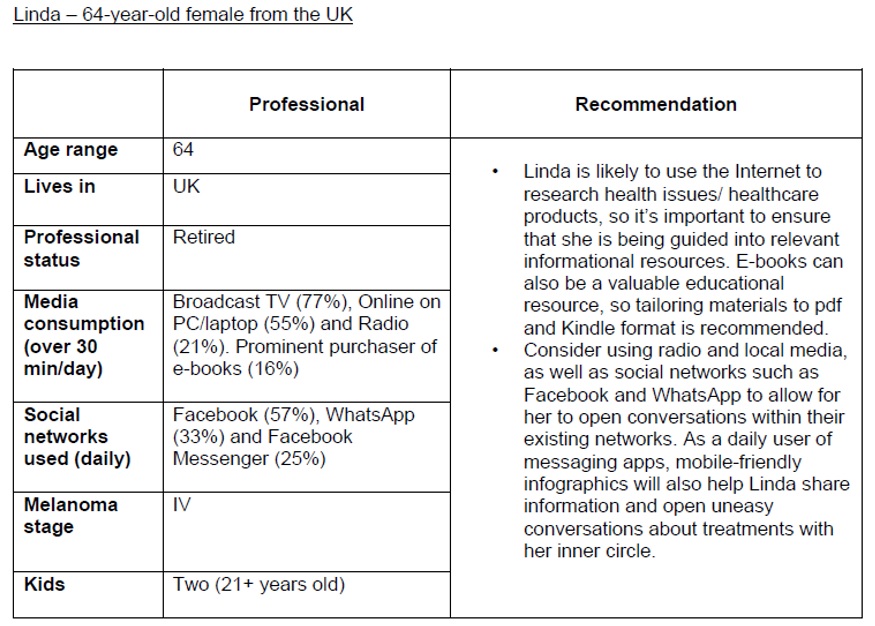 The data was also used to create patient personas of UK melanoma patients. This technique was used to understand the needs of melanoma patients and identify the most effective digital communications channels to incorporate into a strategy.