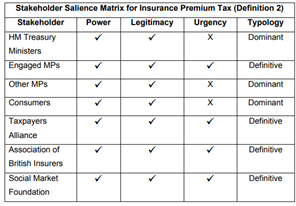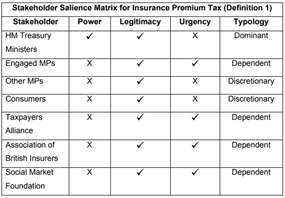 This stakeholder analysis demonstrated that HMT Ministers, including the Prime Minister as First Lord of the Treasury, should be considered as dominant stakeholders as they have power over tax policy and the legitimacy that comes with their office. HMT has the final say over Budgets, Spending Reviews and general tax policy and sets the fiscal agenda. The Government also controls the Business of the House. However, the situational research had also shown a lack of urgency on their part to reform IPT.
