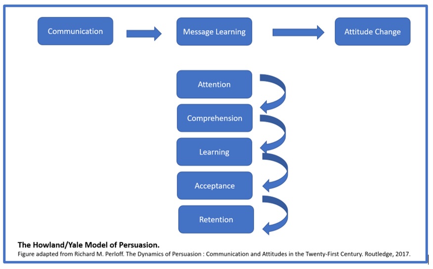 As illustrated in the Figure below, researchers Howland and the team at Yale University were interested in understanding why messages changed attitudes, with a focus on learning and motivation. Persuasion entailed learning message arguments and noted that attitude change occurred in a series of steps. In order to be persuaded, people had to attend to, comprehend, learn, accept and retain the message, before behaviour change was observed[xiii]. This takes time.