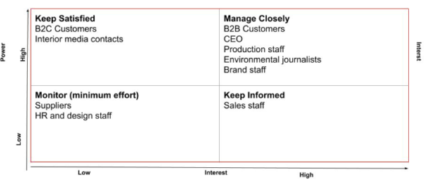 The matrix helped to identify the most important stakeholders which included customers, staff, environmental journalists and interior media contacts.