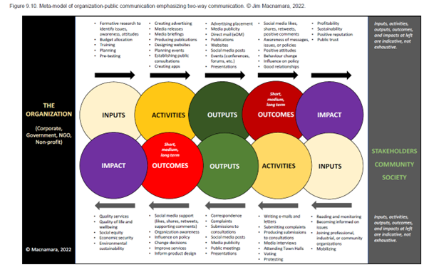 Jim Macnamara, for many years a thought and practice leader when it comes to the evolution and improvement of the measurement and evaluation of public communication (advocating organisational listening as the fundamental skill), provides a similar perspective in his recent work, which among others is based on large-scale project commissioned by the World Health Organisation post pandemic (Macnamara, 2023). He applies an ‘architecture of listening’ that sees organisational communication as a two-way process: from the organisation to stakeholders, communities, society at large, through a logical progression from inputs to activities, to outputs, outcomes and ultimately, impact. And then the reverse, from the environment to the organisation, through the same logical steps: