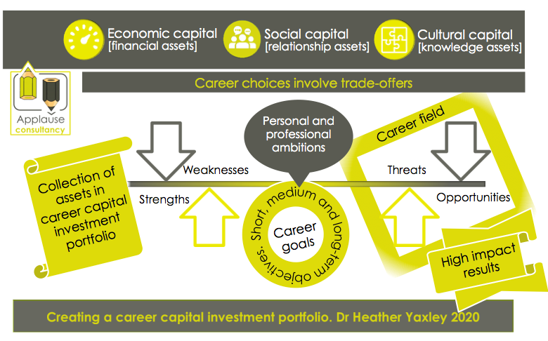 Career choices involve trade-offs in balancing the strengths and weaknesses in your portfolio of assets, alongside your personal and professional ambitions, and any opportunities and threats that may be anticipated when developing sustainable career capital in particular industries, organisations, occupations or roles.