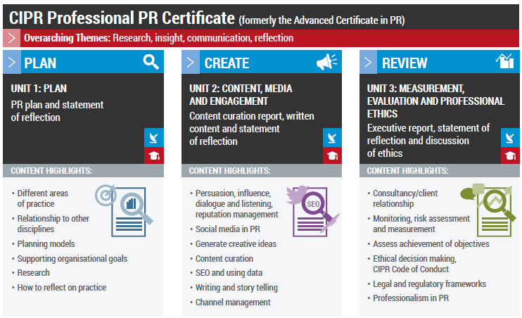TheĀ CIPR Professional PR Certificate is a new course replacing the Advanced Certificate this year. It’s been designed for those with some experience in public relations (or a related discipline) who are looking to progress in their chosen field.