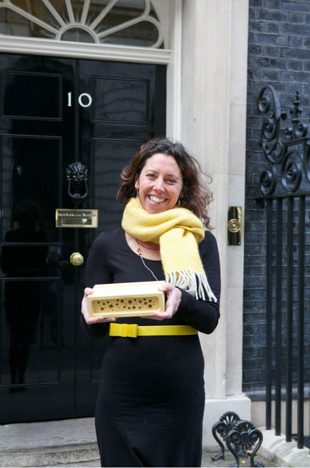 Faye Clifton with bee brick at 10 Downing Street