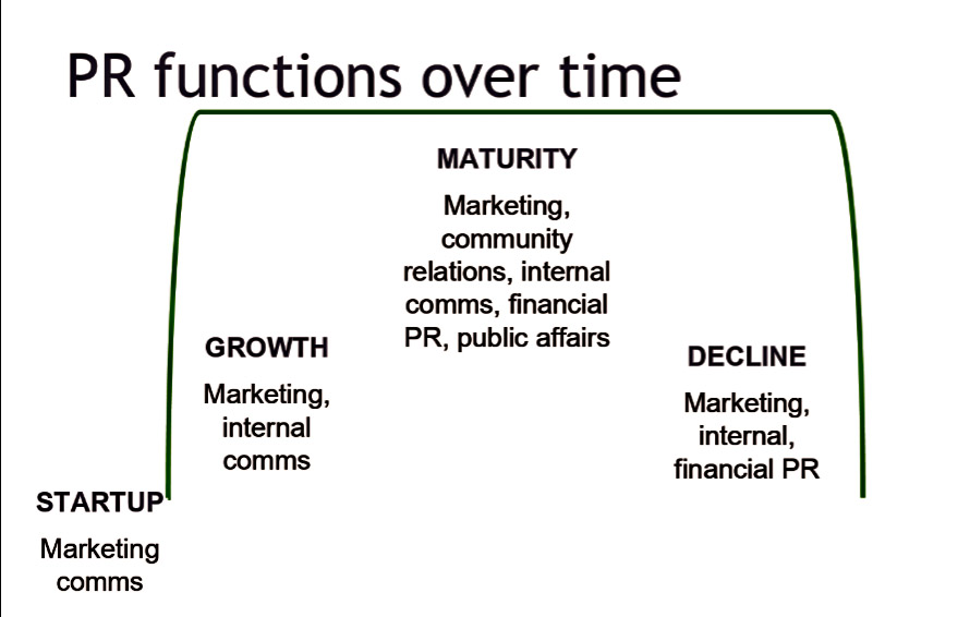 In “The Fall of Advertising and the Rise of PR” Al Ries and Laura Ries argue that you can’t launch new brands with advertising, you have to lead with PR. The authors cite some impressive examples including Google and Microsoft. The form that PR takes will differ during the life of a brand. PR Place editor and university lecturer Richard Bailey suggests it looks a bit like this: