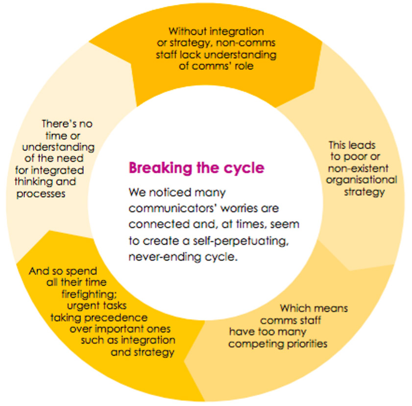CharityComms concluded that the top 5 problems highlighted in their report formed an interesting cycle [Fig 1]. Without clear strategy, the cycle is unbreakable. Meanwhile, 31% of respondents said that clearer strategy would make their communications more successful, and ‘strategy’ was the second most mentioned word (after ‘communications’ – obviously). The findings suggest that investment in strategy is the answer to many communications professionals’ problems, which would also reduce stress for staff and provide clarity around priorities and communications objectives.