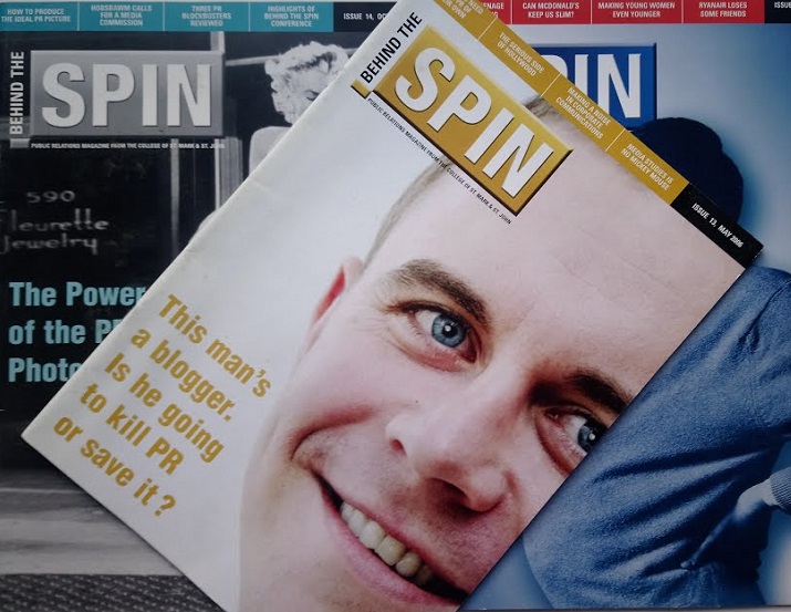 It’s the cover of the May 2006 edition of Behind the Spin, then a printed magazine. It shows Stephen Davies, then a PR student at University of Sunderland, with the alarming strapline: ‘This man’s a blogger. Is he going to kill PR or save it?’
