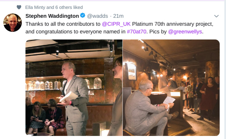‘What a very special evening this is; marking 70 years of the CIPR with the volunteers who keep it relevant, forward-looking and a wonderful community to be part of. As well as celebrating our 70 at 70, tonight we also mark the launch of Platinum, authored by many of you here, under the capable eye of editor Stephen Waddington.’