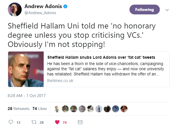 - Lord Adonis claims he was asked to tone down his criticism of university vice chancellors’ pay in order to receive an honorary degree from Sheffield Hallam University. He declined – and went public with the university’s request.