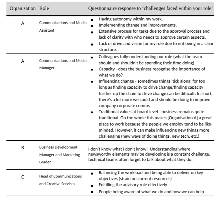 The practitioner insight highlighted the practical challenges (shown below) and implications of the absence of this within their organisations, concurrent with theoretical suggestions that the true value of corporate communications is often not recognised by organisations, particularly in this case, civil engineering organisations. This highlighted the managerial behavioural drivers which may be influencing the positioning of the corporate communications function.