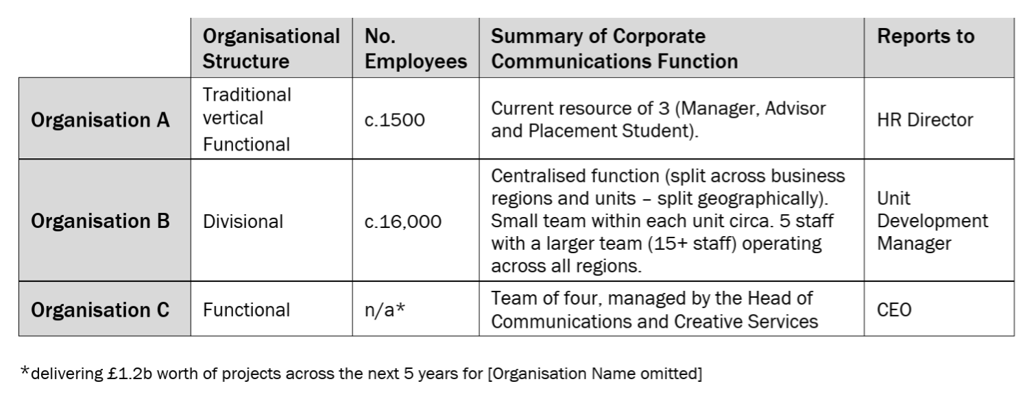 The positioning and reporting structure of the corporate communications function was different in all three organisations (shown below), possibly illustrating the argument that there is no ‘best fit’ for all organisations. However, also emphasising a lack of consistency in approach across civil engineering organisations.